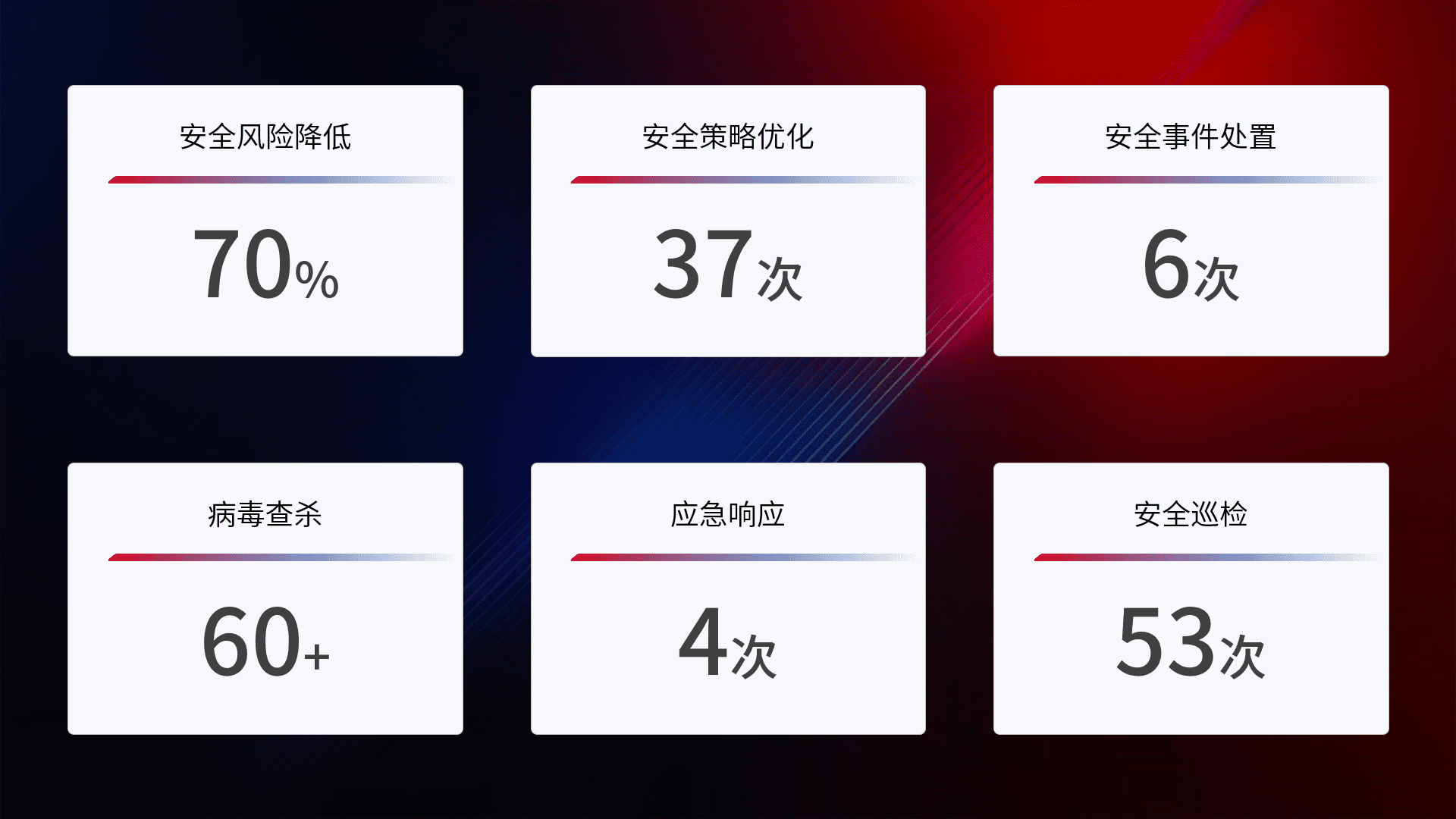 提供全面的安全事件报告体系,,包括处置报告、、、、周报、、、、季度和年度总结,,结合持续监控,,帮助客户深入了解网络安全状况。。。